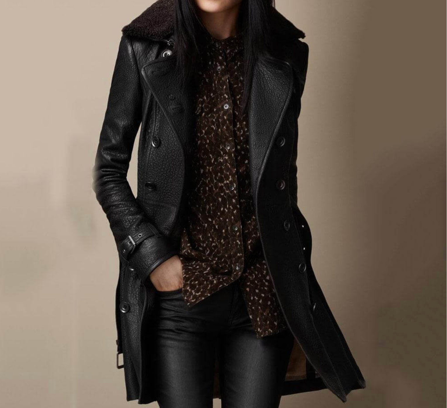 This long black coat features a textured leather finish with a structured double-breasted design that instantly elevates any outfit. The tailored silhouette creates a sleek, confident look, while the soft inner lining and wide sherpa-style collar add warmth and comfort for colder days.